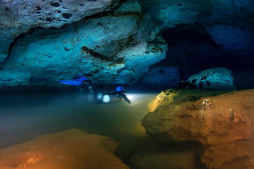 A diver swims through Manantial del Toro cave where clear fresh water fills the upper part of the chamber above cloudy salt water below. The slime curtains live in the salty water. Credit: Laurent Benoit