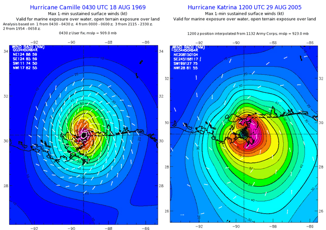 Side-by-side diagrams of Hurricanes Camille (1969, category 5) and Katrina (2005, category 3) show the vast difference in their sizes. Credit: Mark Powell, NOAA Hurricane Research Center