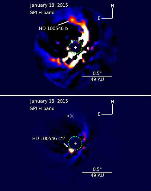 New observations have confirmed that the object HD 100546 b (top), which is up to 34 times as massive as Jupiter and orbits a youthful star some 320 light-years from Earth, is a still-forming planet. The recent images of the surroundings of HD 100546 (the star) have revealed what appears to be a second still-growing planet, dubbed HD 100546 c (bottom). It could weigh in at up to 1020 Jupiter masses. Credit: Gemini Observatory/AURA/Thayne Currie – NAOJ