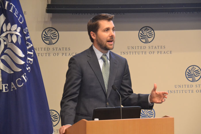 Brian Deese, senior advisor to the president for climate change and other issues, speaking at the launch of the Climate Services for Resilient Development partnership. Credit: Randy Showstack