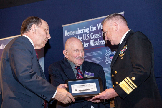 National Weather Service Director Louis Uccellini (left) and National Oceanic and Atmospheric Administration Deputy Undersecretary for Operations Vice Admiral Michael Devany (right) present a commemorative plaque to Richard Fodor. Fodor’s older brother Lester died in September 1942 from a U-boat attack while serving as a weather observer for the U.S. Weather Bureau. Credit: NOAA