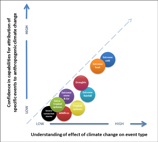 Scientists can now determine with varying levels of confidence how much climate change plays a role in specific extreme weather events. Increased confidence correlates to better understanding of the effect of climate change on a type of event, notes the report from the National Academies of Sciences, Engineering, and Medicine. Credit: NASEM