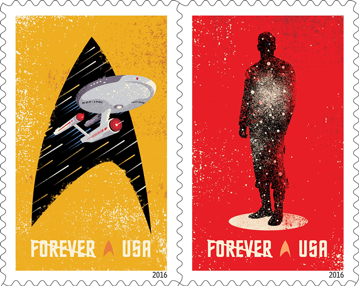 Celebrating the 50th anniversary of the television premiere of Star Trek, the new Star Trek Forever stamps showcase four digital illustrations inspired by classic elements of the television program: the Starship Enterprise inside the outline of a Starfleet insignia, the silhouette of a crew person in a transporter, the silhouette of the Enterprise from above, and the Enterprise inside the outline of the Vulcan salute (Spock’s iconic hand gesture). Credit: ©2016 USPS