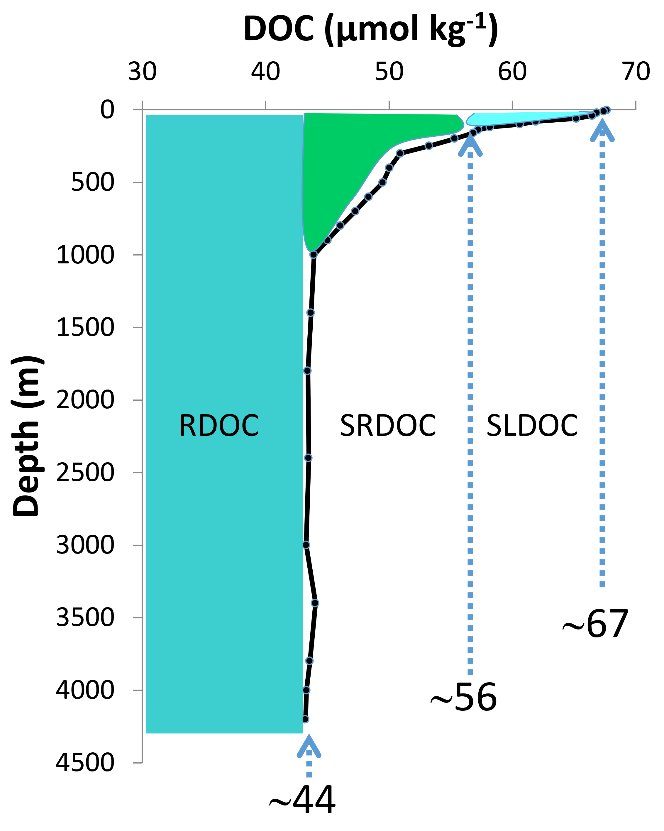 Fig. 1. DOC profiles (solid line, with sampling depths from August 2008 indicated) and fractions (shaded regions) assigned in the western Sargasso Sea. Concentration boundaries of the fractions shown are approximate. RDOC, refractory DOC; SLDOC, semilabile DOC; SRDOC, semirefractory DOC. From Hansell [2013].