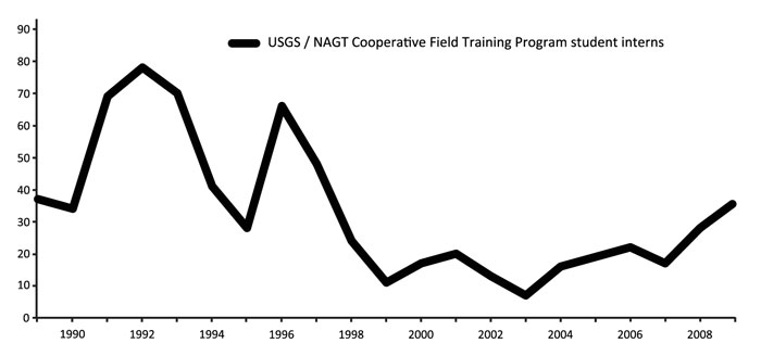 Fig. 2. Graph of data from the past 20 years showing the total number of student interns involved with the U.S. Geological Survey/National Association of Geoscience Teachers (NAGT) Cooperative Field Training Program. The 1990s generally are characterized by a downward trend and the 2000s generally are characterized by an upward trend, although these trends may have been partly dependent on the availability of internships. Data were compiled from the NAGT Web site (http://serc.carleton.edu/nagt/programs/usgs_field.html).