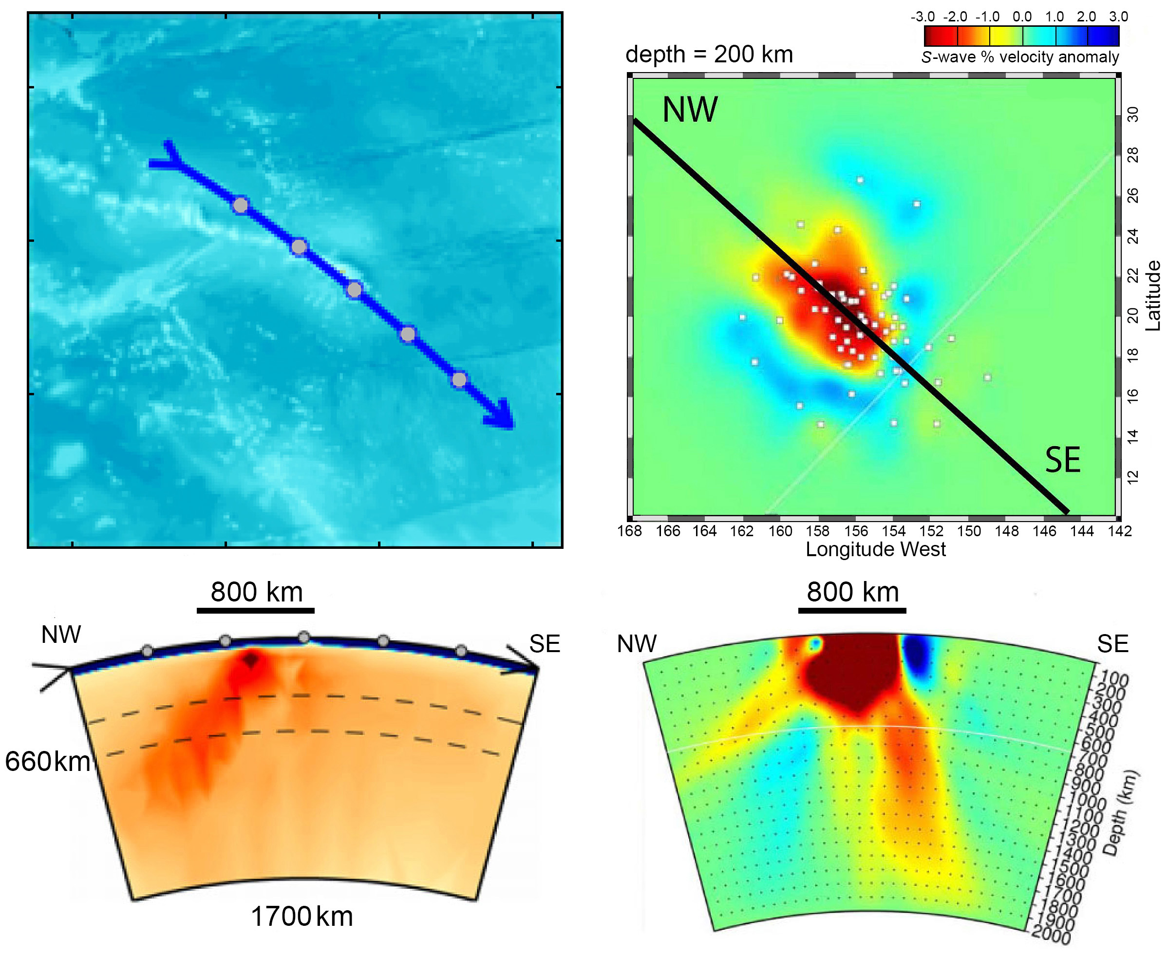 Fig. 2. Lack of repeatability in recent studies of Hawaii: (left) from Li et al. [2008], showing a low-velocity body, interpreted as a plume, tilting from the Big Island of Hawaii to the northwest beneath the Hawaiian island chain; (right) from Wolfe et al. [2009], showing a similar low-velocity body, also interpreted as a plume, except tilting in the exact opposite direction—from beneath the Big Island of Hawaii to the southeast.