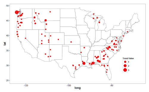 Locations of stream systems that may soon experience significantly low flows. Color bubbles indicate location of the stations and loss-of-flow estimates in cubic feet per second (cfs) per day per year. The size of the bubble is proportional to the magnitude of trend value. The image was generated using data from the U.S. Geological Survey’s Hydro-Climatic Data Network. Credit: Maryam Pournasiri Poshtiri and Indrani Pal