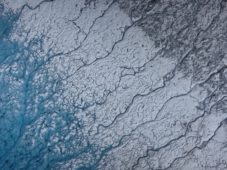 Aerial photograph taken on 24 July 2015 over the southwest portion of the Greenland ice sheet, near Kangerlussuaq. (left) The turquoise color is characteristic of meltwater on the shore of a supraglacial lake. (center) Area from which the lake water has receded, removing impurities and leaving bare ice. (right) Ice and snow covered by surface impurities. Credit: Marco Tedesco