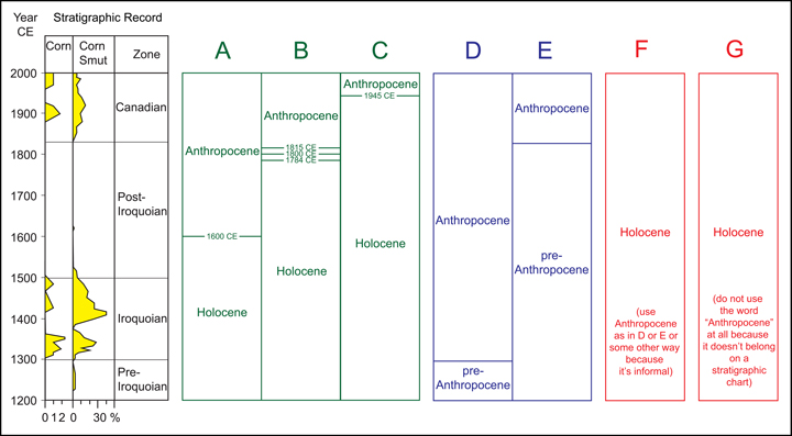 Fig. 1. (left) A simplified pollen/spore diagram (redrawn from McAndrews and Turton [2010]) of the record from a lake sediment core with annual layers in southern Ontario, Canada. Variations in percentage of corn pollen (labeled “corn”) and spores from a corn smut fungus serve as a proxy for human impact. Chronology comes from layer counts and radiocarbon dating. (right) Seven of the many concepts of the word “Anthropocene” (A–G) that divide this record. CE = Common Era. For additional discussion of various choices, see, for example, Autin and Holbrook [2012], Edgeworth et al. [2015], Finney [2014], Gale and Hoare [2012], Gibbard and Walker [2014], Lewis and Maslin [2015], Ruddiman et al. [2015], Steffen et al. [2015], and Zalasiewicz et al. [2014, 2015].