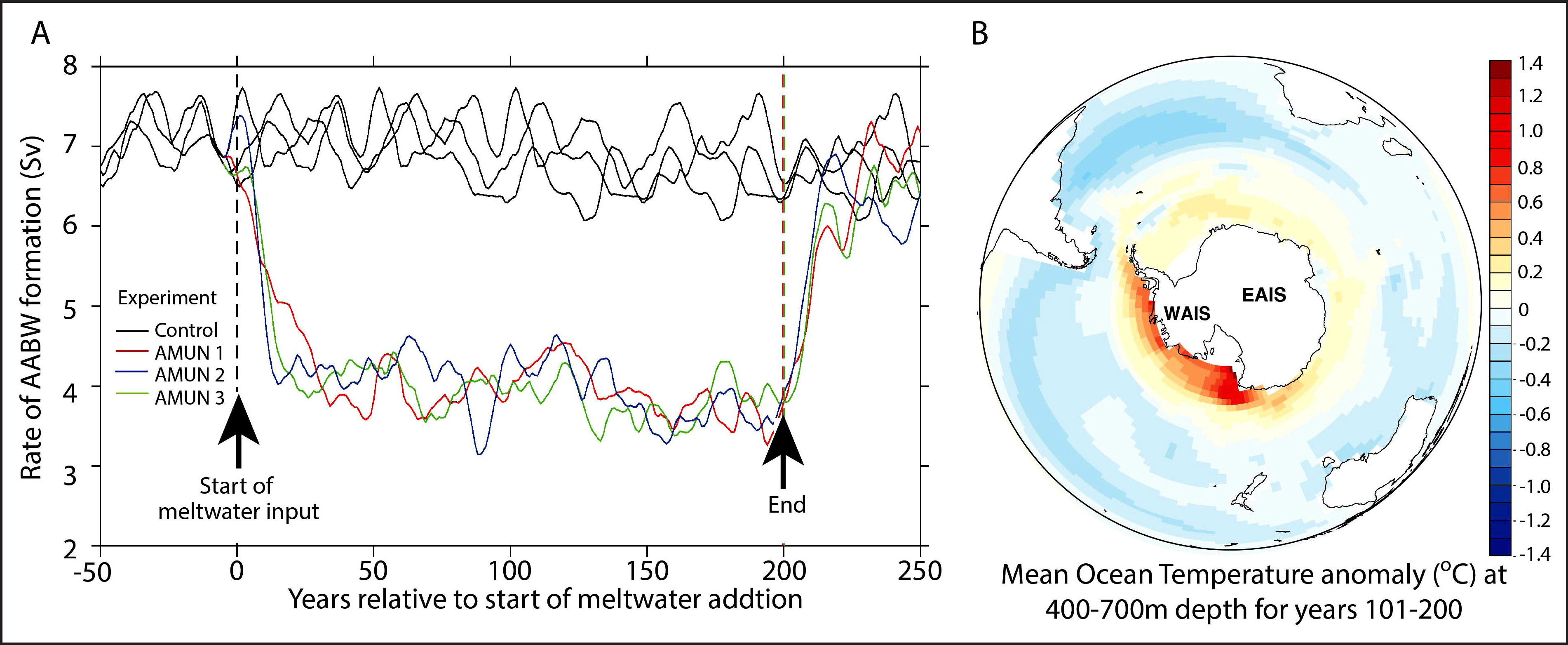 (a) Predicted cPredicted changes in (A) the rate of Antarctic Bottom Water formation, based on hypothesized collapse of the Amundsen Sea sector of the WAIS over 200 years (termed AMUN), plotted against the pre-industrial control simulation to demonstrate the background natural variability (10- year running means). (bB) Tthe average ocean temperature anomaly (degrees Celsius∘C) between 400 and 700 meters across the Southern Ocean predicted for years 101–200 of the experiment (relative to the start of meltwater addition). Credit: Christopher Fogwill