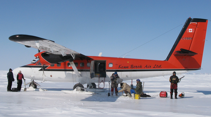 Researchers use aircraft on skies to sample the ocean beneath the ice. Credit: Eddy Carmack