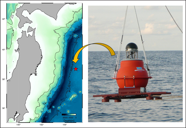 The location of the observed site (left) and an acoustic device deployed there for GPS/Acoustic survey (right). Credit: Fumiaki Tomita