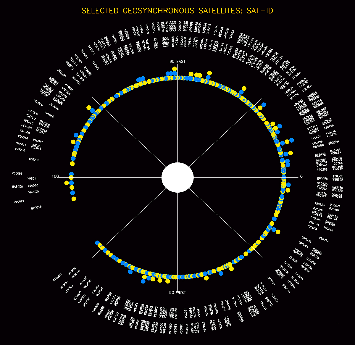 The positions of 403 geosynchronous satellites around the Earth in terms of geographic longitude, east and west of 0°. International satellite identifiers are also plotted. Two colors are used to better visualize the satellite locations, and satellites are stacked when they are located very close together. Credit: Mick Denton; satellite list from SatSig