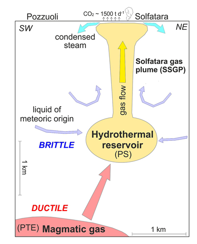 Fig. 2. Conceptual model depicting the release of magmatic fluids from the shallow magmatic source (red) toward the hydrothermal system (yellow) below the Solfatara volcanic crater, where these fluids mix with meteoric liquid (i.e., groundwater from rain; modified from Chiodini et al. [2015], used with permission). PTE (pressurized finite triaxial ellipsoid) and PS (pressurized oblate spheroid) are the deformation sources active at Campi Flegrei at least since 1980 [Amoruso et al., 2014].