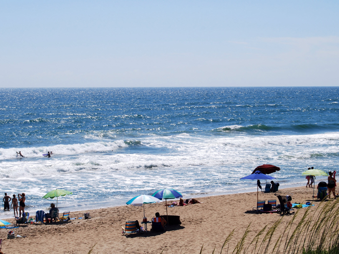 A rip current on North Carolina’s Outer Banks. The rip current is visible in the center of the photograph where there is a flat spot in the line of breaking waves, and where foam is seen moving offshore. Credit: Gregory Dusek