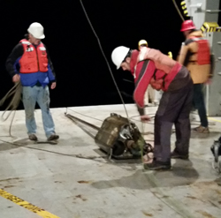 Fig. 2. Crew recovers a heat flow probe during the STINGS experiment. Credit: N. Rocco, Oregon State University