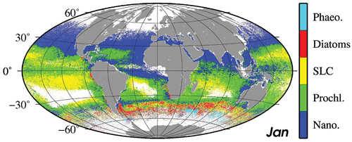 Climatology for the month of January (Sea-viewing Wide Field-of-view Sensor data, 1998–2010) of the dominant phytoplankton groups (Phaeocystis-like diatoms, Synechococcus-like cyanobacteria, Prochlorococcus, and nano-eukaryotes). Improved phytoplankton functional type algorithms are anticipated from the next generation of hyperspectral OC satellites. Credit: IOCCG Report 15
