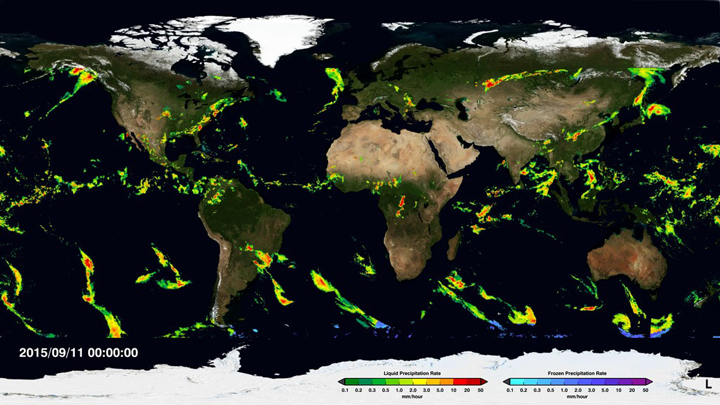 Liquid and frozen precipitation rates, from NASA’s Integrated Multi-Satellite Retrievals for GPM (IMERG) product. IMERG combines data from the Global Precipitation Measurement (GPM) mission, a constellation of domestic and international satellites, to form a single, seamless map. These data depict how rain and snow move around the world, which is critical for understanding Earth’s water and energy cycles. Data are available globally on GPM pages. Credit: NASA/GSFC