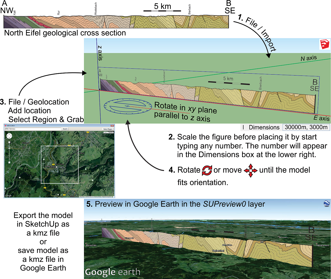 Fig. 1. Five-step workflow for setting up and exporting a vertical cross section from SketchUp Make into Google Earth. Example shows a 30-km-long, NW-SE geological cross section through the North Eifel mountains in Germany [Van Noten et al., 2011]. Source: “NW Eifel” NW coordinates = 50.6166°N, 6.2511°E; SE coordinates = 50.3982°N, 6.5001°E. Google Earth. Satellite photo taken 2 August 2007. Image captured 7 July 2015. Eye altitude 2.21 km. DigitalGlobe 2015.